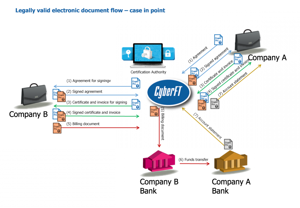 Via CyberFT companies can interact not only with banks, but also with each other, thus organizing an electronic document flow of legally valid documents. For instance, having established trustful relationship, both participants can exchange contracts, invoices and other business-related information electronically.